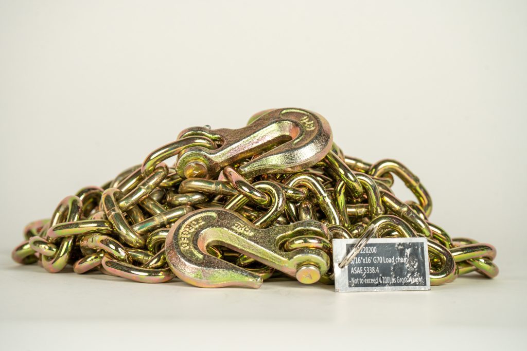 These G70-rated, 5/16” and 3/8” chains are light yet strong, with high tensile strength and superior abrasion resistance. Precut to 16’ lengths and assembled with grab hooks, they’re ready to hook onto trailer rails, stake pockets, or their own links. They can help with tying down flat-deck cargo like hard-edged lumber, construction materials, and heavy-duty agricultural and industrial equipment.